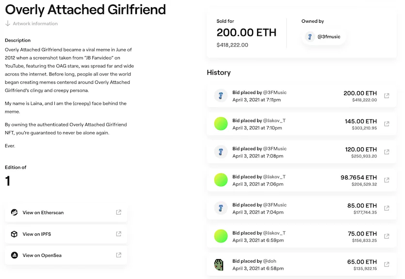 On Friday, Laina put the NFT up for a bid on Foundation for a starting bid of 0.05 ETH. The NFTs description said, “By owning the authenticated Overly Attached Girlfriend NFT, you’re guaranteed to never be alone again. Ever.”