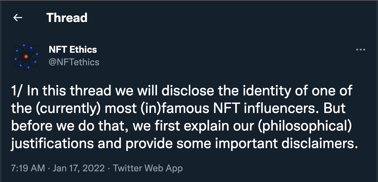 The first thread to be posted was from NFT Ethics, a self-appointed watchdog of the NFT space. In a 70 tweet mega-thread, NFT Ethics claim Beanie has been scamming his audience and is a serial scammer.Â