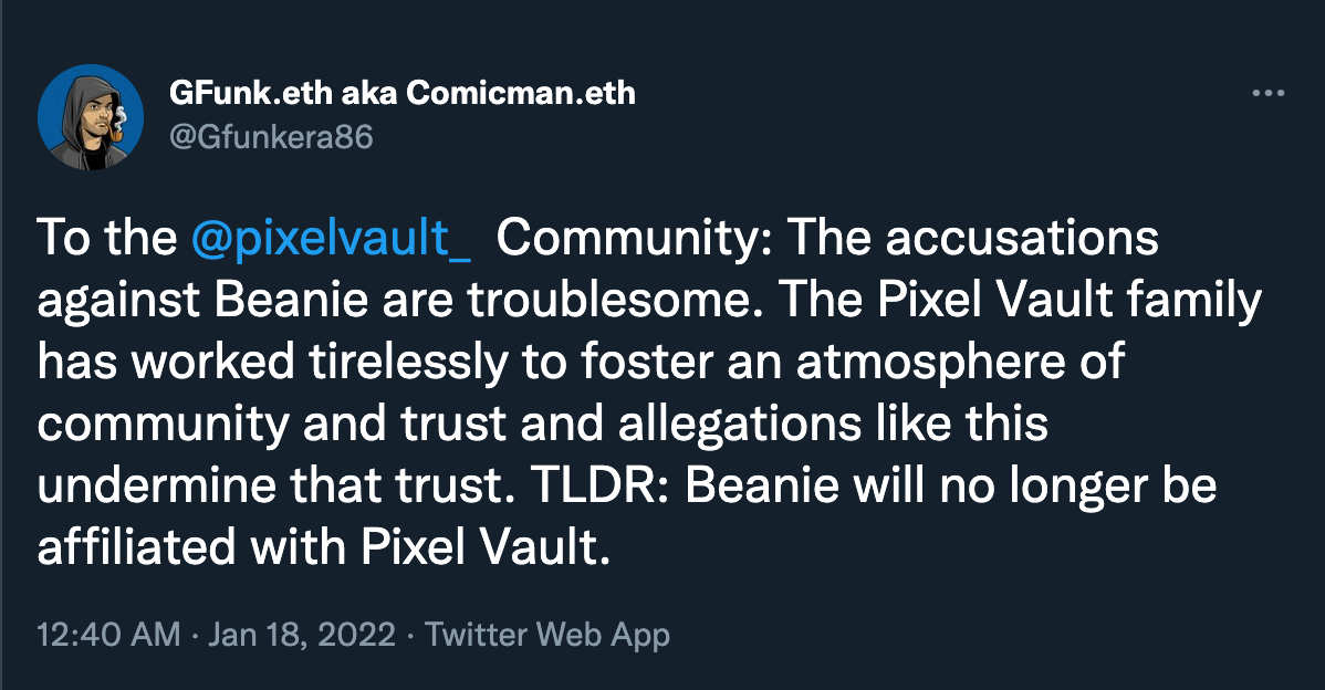The accusation of Beanie being a serial scammer resulted in many influencers and projects distancing themselves from him. One of the most notable was done by Pixel Vault, where GFunk, founder of Pixel Vault, tweeted a thread saying Beanie is no longer a part of the project.