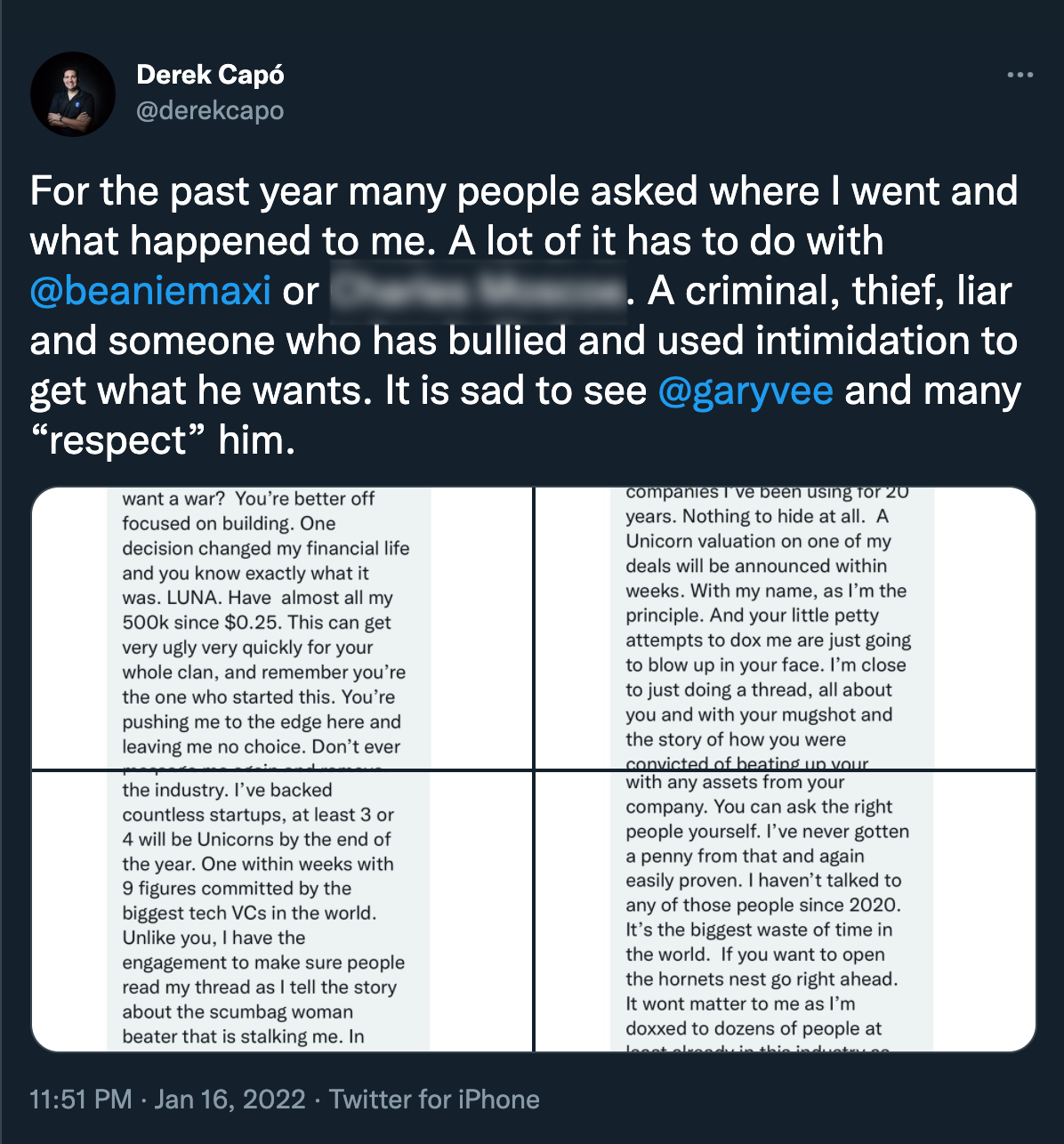 The second thread to come out this week came from Derek Capo, a supposed former colleague of Beanie. In the thread, Capo shows screenshots of a conversation he had with Beanie and calls him out for his behavior. He also released pictures of Beanie, but Twitter took the post down.Â