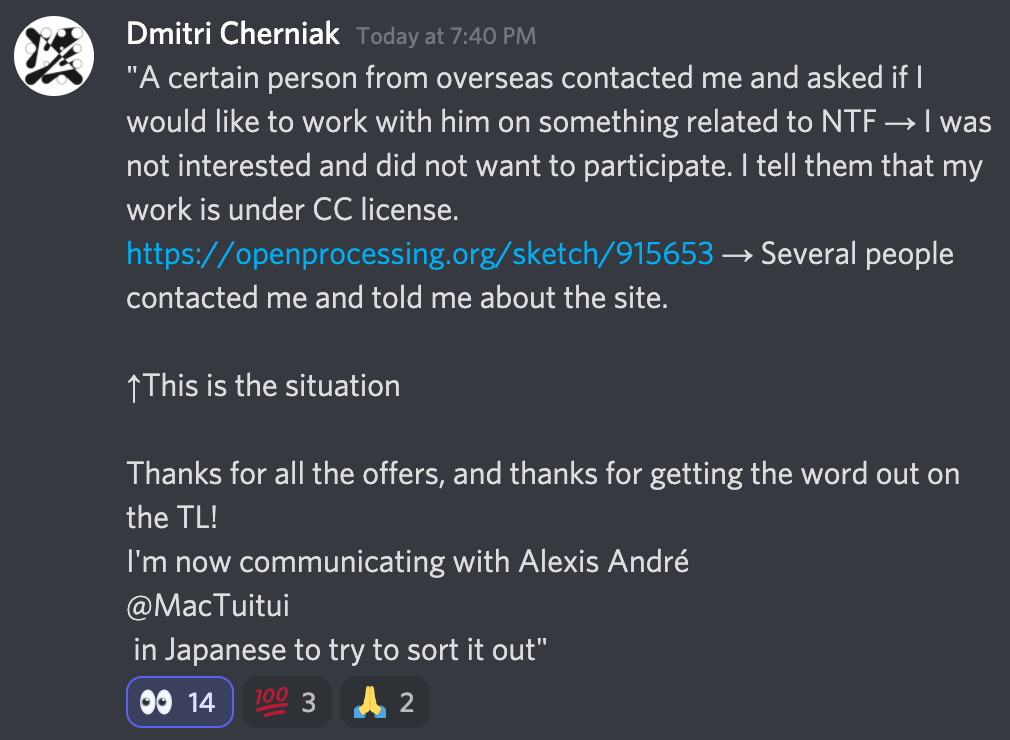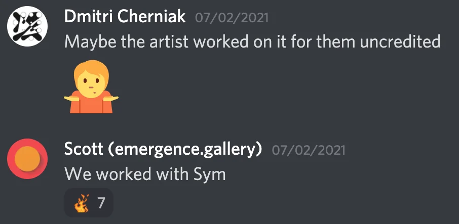 With the help of another fellow Art Blocks Artist Alexis Andre, Dmitiri reached out to SYM to confirm directly if he was indeed aware that his work was being used by Scott for AERIALS on the emergence gallery. SYM is Japanese and doesn’t speak english so communication wasn’t easy.