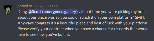 It began a few days ago with a member of the CryptoPunks Discord, Scott (emergence.gallery) seeking helpful advice on an ‘upcoming project’ of his own, from community members and even other platform creators whose projects had already achieved what he was himself hoping to. His full intentions were not entirely clear to those being helpful enough to advise.