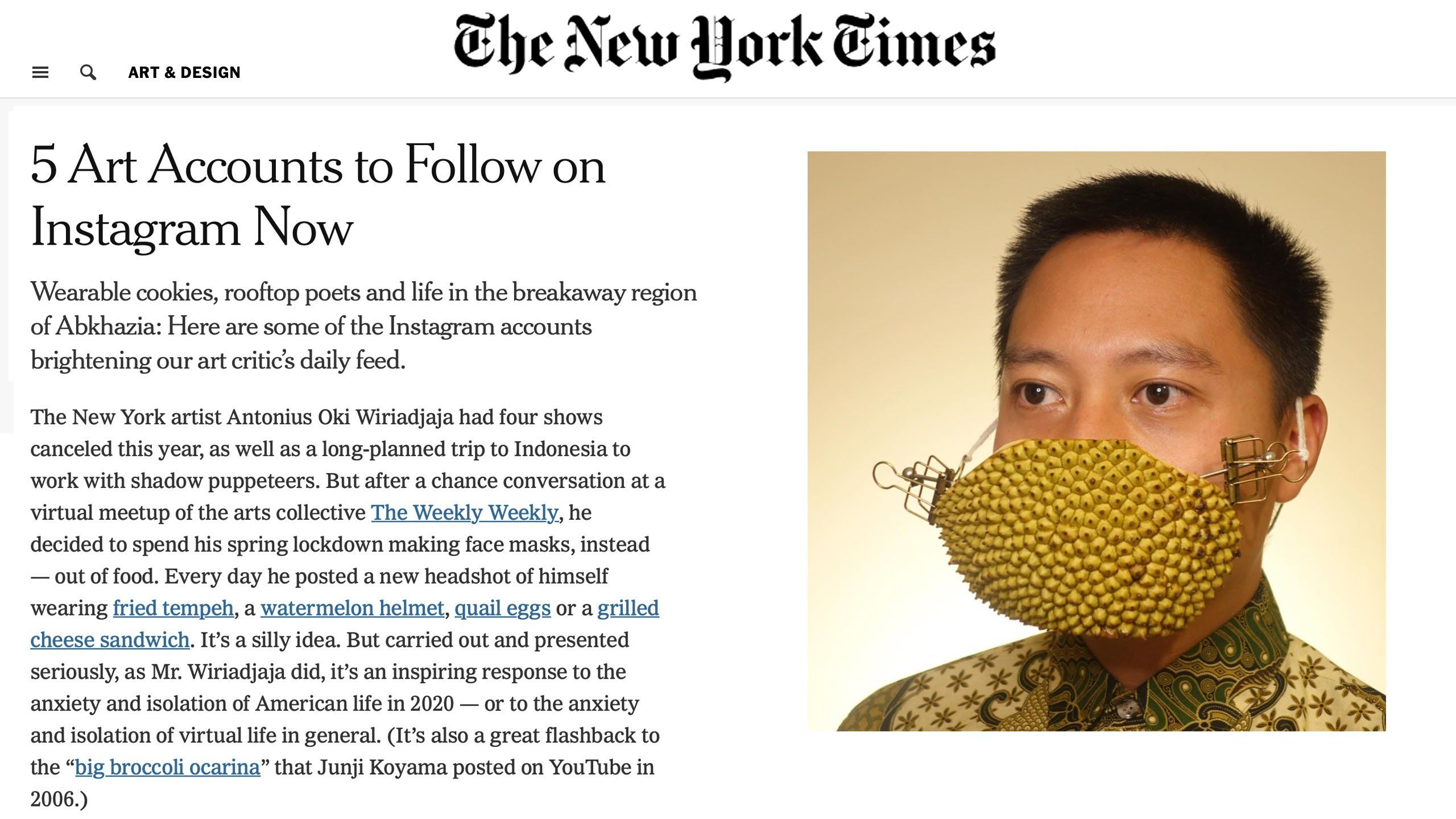 Antonius Wiriadjaja is a multimedia artist based in Newyork city. He is a former Fullbright U.S scholar in Indonesia and currently teaches at the Borough of Manhattan Community College. Seeing a fellow artist wear a pickle face filter during a Zoom meeting during the pandemic self-isolation period is what inspired Antonious. He created an account on Instagram @foodmasku - and posted pictures of making his food into face masks.