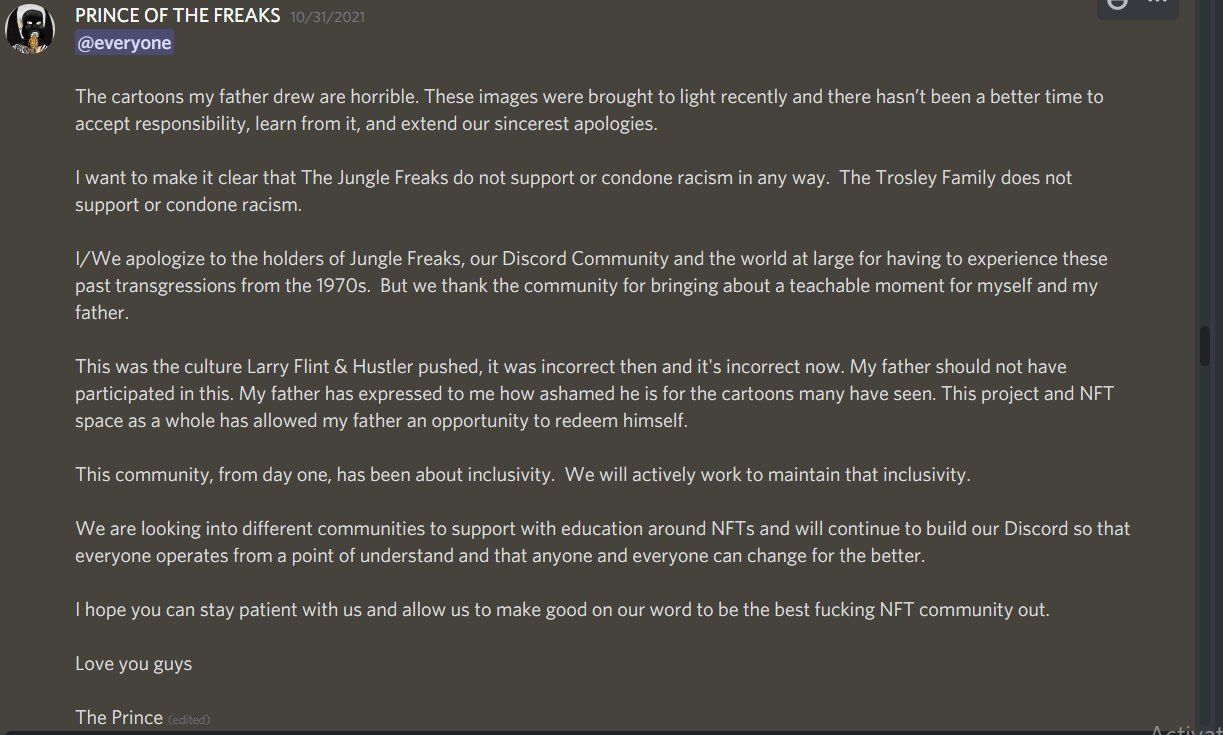 The popular collection Jungle Freaks by Trosley was under the spotlight for all the wrong reasons this week. NFT Twitter reacted harshly and with a zero-tolerance policy to racism after it was discovered that the artist, George Trosley, had drawn a number of disturbing cartoons for Hustler Magazine in the 1970s. To make matters worse, it appeared that the creators began selling off NFTs from their personal collection as the news broke and initially took a defensive stance. That later changed when George Trosley published a long piece on Medium in which he explained the culture and expectations at Hustler at the time.