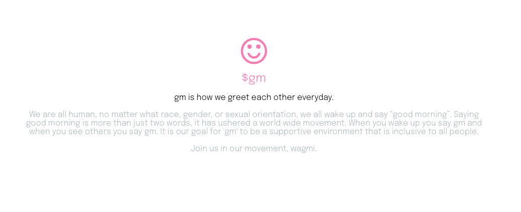 $gm is (currently) a spoof project that began as an opportunistic approach to extract every bit of value from the already-competitive memecoin economy. We all know Doge as the first mover and Shiba Inu as its derivative, but there have recently been breeds of animal-based and other tokens promising the Moon, Mars and Lambos. Most of these projects are scams feeding off of ignorance and greed (which usually go hand-in-hand as FOMO), with no trading liquidity, resulting in some users holding bags they can never dump.