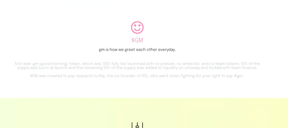 The project’s main selling point is capturing tier-2 exchange listings early on for liquidity fed by aggressive influencer shilling. The project website has only limited information: “We are all human, no matter what race, gender, or sexual orientation, we all wake up and say “good morning”. Saying good morning is more than just two words, it has ushered a worldwide movement. When you wake up you say gm and when you see others you say gm. It is our goal for 'gm' to be a supportive environment that is inclusive to all people.”