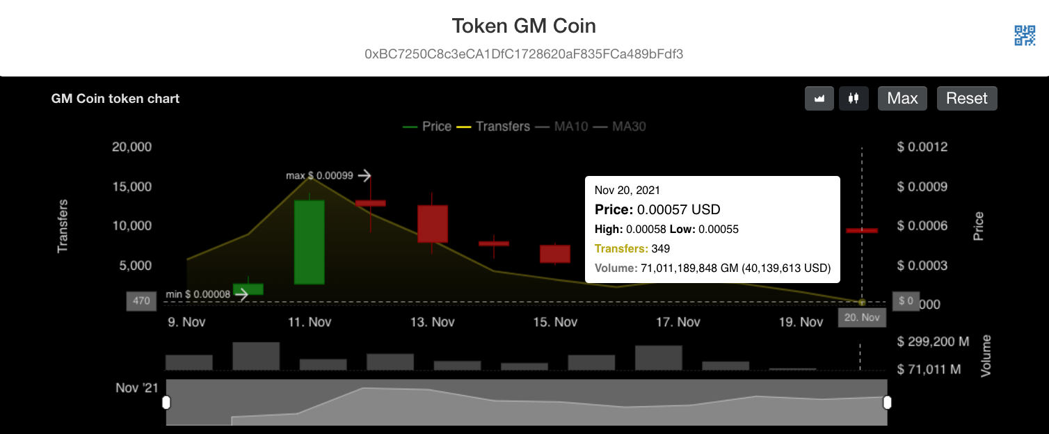 The token had a significant surge on November 11 when it clocked $40 million worth of volume on Uniswap with just 349 transfers, which appears unnatural. That was enough to get the attention of some YOLO traders and moonbois.
