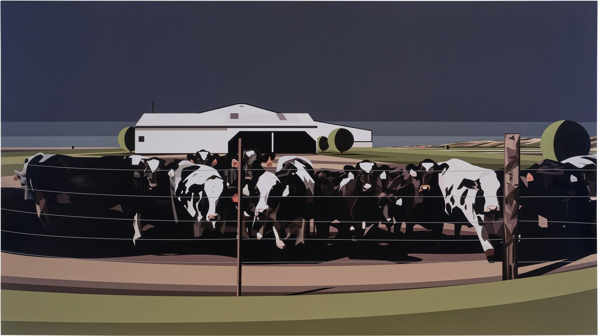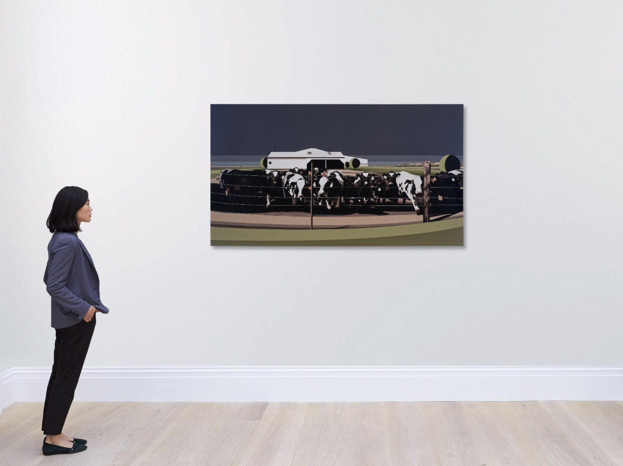 The composition demands careful introspection. The sky, painted with cool undertones, exudes an aura of anticipation, contrasting starkly with the sunlit vibes usually associated with California. Yun's brilliance is further exemplified by the canvas's dominant horizontal lines, crafting depth and immersing spectators within the artwork. This style elucidates the tension between California's vast landscapes and the confined arena of the cows.