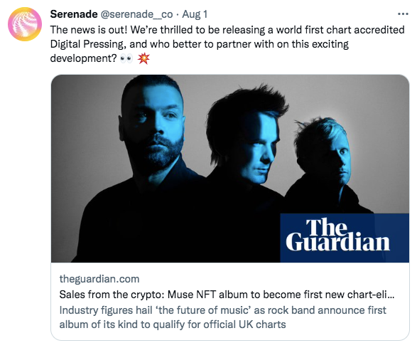 The OCC made NFT albums eligible for chart inclusion back in April. Amazons were the first band to capitalise and release an NFT box set but this was classed as âcontaining NFT contentâ (unreleased photographs from the bandâs past). It wasnât a standalone release and therefore wasnât included in the charts. âWill of the Peopleâ represents full commitment from a band who aren't new to the NFT space. Muse released digital collectables via CryptoKitties back in 2020 and has always adopted an anti-authoritarian stance that lends itself well to the world of DeFi. Max Shand, Serenadeâs CEO, described their âgreat appetite for innovation and pushing the boundaries of how they deliver their music to fans,â making them an obvious choice.