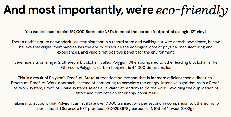 Serenade is notable because it allows users to purchase NFTs using a debit or credit card; you don't need a crypto wallet. Anybody with an existing wallet is free to use it, otherwise, Serenade will create a new one upon purchase and transfer the NFT automatically. The emphasis is on bringing new people into the NFT space and knocking down any technological barriers that kept them away. Serenade doesnât charge gas fees and strives to replicate the âfrictionlessâ performance of traditional e-commerce platforms.