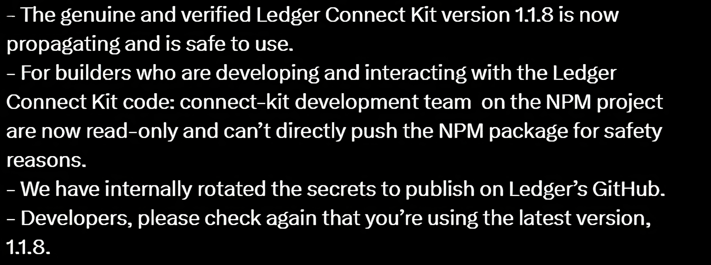 Ledger coordinated efforts with WalletConnect to disable the rogue project and began the process of propagating a genuine and verified version of the Connect Kit (version 1.1.8).
