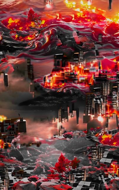 As a palette refresher, let’s look at crashblossom’s version of a landscape: Descentraland. There is an obvious layer of humor in this work. The pun of “descent” inserted into the metaverse project “Decentraland” is a nod to the project’s crashing value. The glitchy burning city imagery reinforces the title’s joke. Yet there is a deeper layer here. “Gradient Descent” is a process commonly used in machine learning. It tunes the accuracy of AI outputs. In other words, Gradient Descent helps AI get better and better over time. And the result? Perhaps the dystopian imagery of “Descentraland” is crashblossom’s answer!