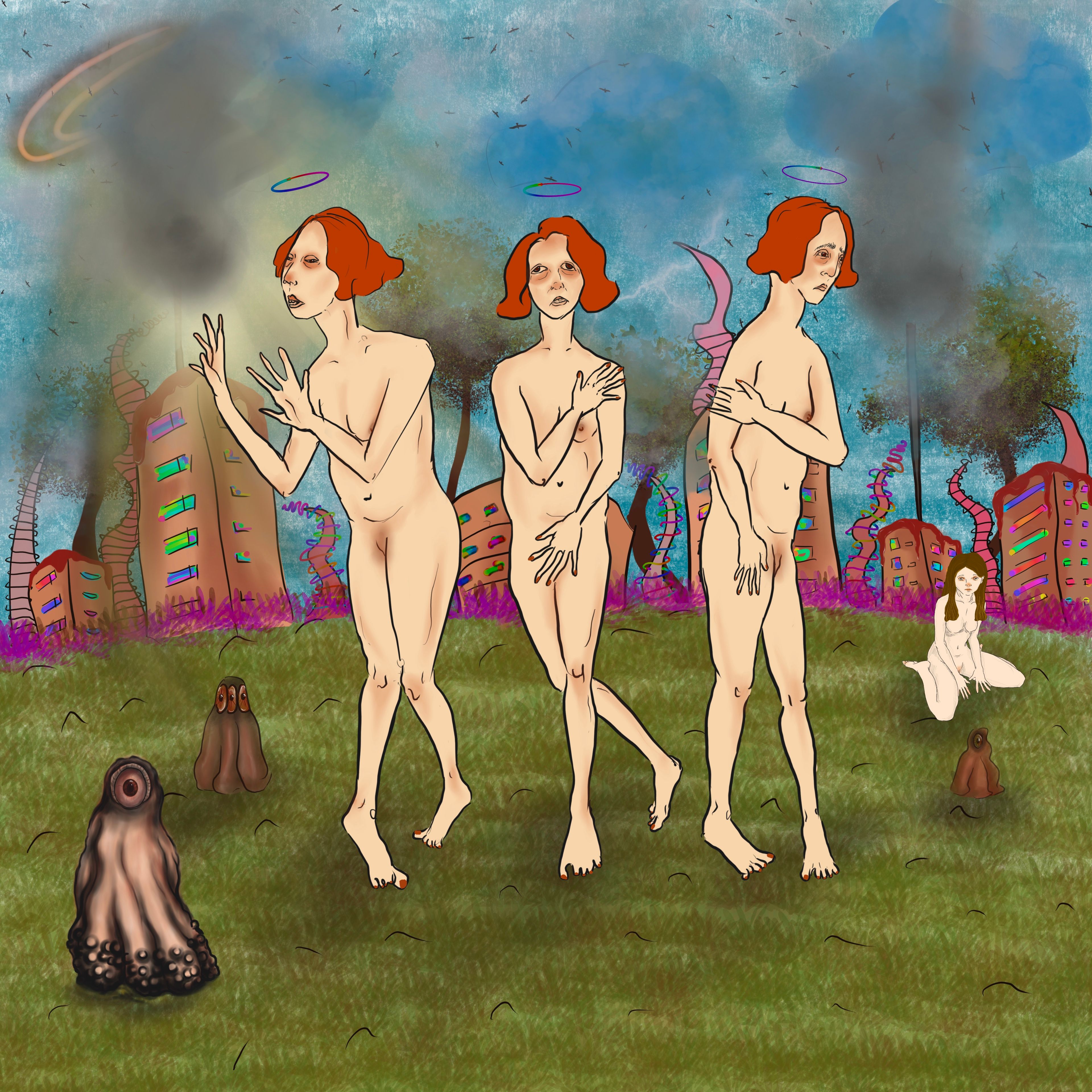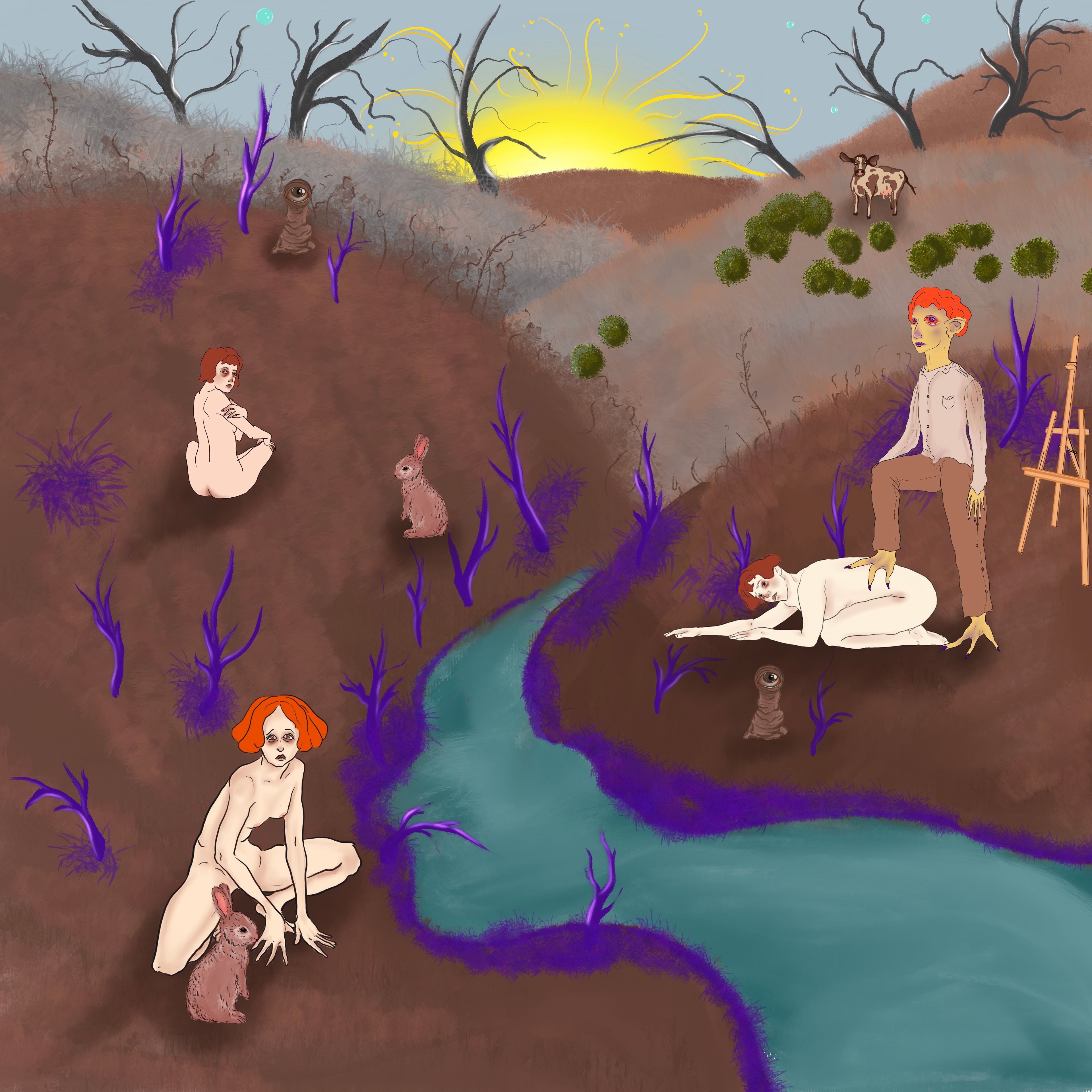 A: The red-haired figure is both inspired by myself and represents the individual in society. I wanted to make their physical features independent of myself and the people around me. In this way, I prevent a composition related to a single person.