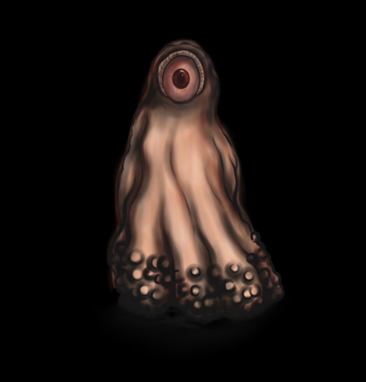 Q: There is a recurring One-eyed octopus, cyclops character (Cycloctopus?) that Iāve noticed in several paintings. Thereās also a giant tentacle in the background of āLost City.ā This reminds me of a Lovecraftian monster. What is this character to you and what does he/she/it represent?