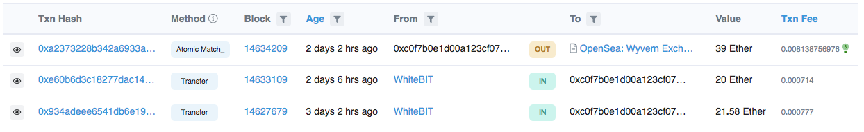 For example, Moonbird #9531 was last sold for 36 ETH (around $106,500). Impressive on paper, but Etherscan shows that the purchase was made from a newly created and newly funded wallet with just 4 transactions, as though it was created soley for this purchase. The user only holds one other NFT: a Misfits Ape priced at a lowly 0.20. While there isn’t anything necessarily wrong or suspicious about this in isolation, it's a pattern with Moonbirds. The even more valuable Moonbird #2048 (bought for 39 ETH) was purchased by another brand new wallet with just 3 transactions.