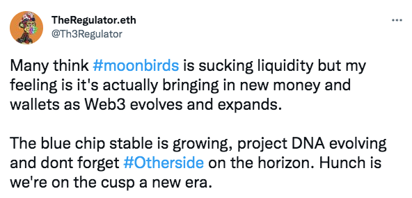The counter-narrative (and the one pushed by Moonbirds devotees on Twitter) is that the collection attracts new capital. These wallets and accounts are new precisely because the collection is bringing new people into the NFT space. Still, prices like 40 ETH seem implausibly high for a first-time collector/investor. Another explanation might be to do with the raffle itself. Twitter is awash with rumours that people created multiple, new accounts to increase their chances of succeeding in the mint raffle.