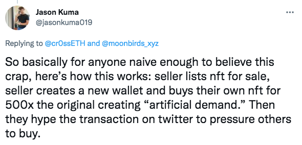 Any collection that surges so quickly is bound to raise questions, especially since the Moonbirds Twitter account only launched in March and (seemingly) hasn't had enough time to build this level of hype. Even the raffle was hit with criticism. One user created over 400 different accounts to launch a Sybil attack, netting 50 Moonbirds in the process. A team member admitted that the raffle was beset by bots and it's unlikely that they were all removed.