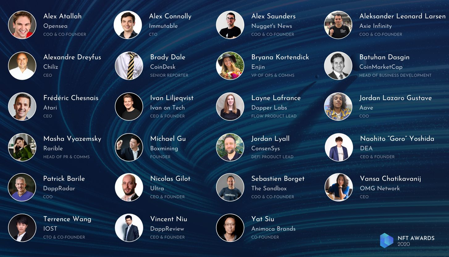 Winners of the 2020 NFT Awards will be awarded in 10 categories: NFT of the Year, People’s Choice, Adoption Potential, Most Innovative, Most Valuable, Gaming, Charity, Art, Utility, and Most Traded.