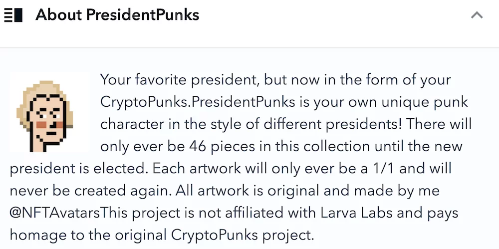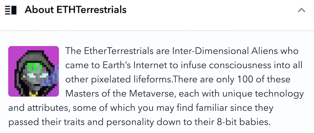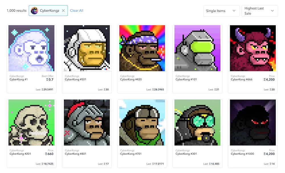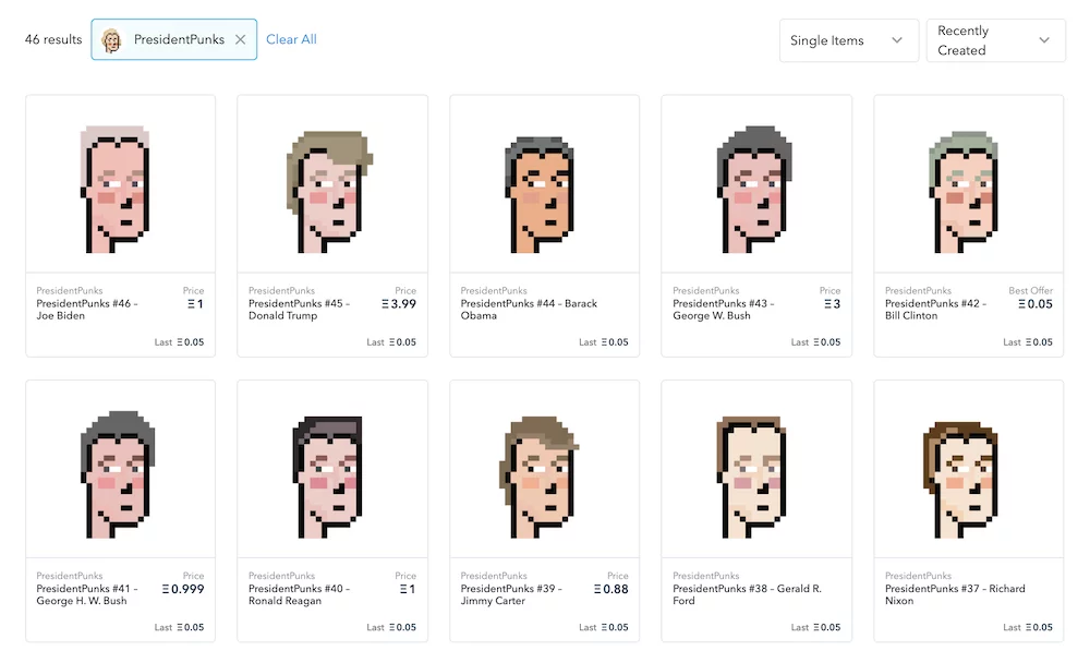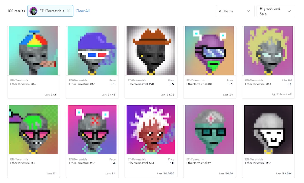 Things are still accelerating. User count continues to grow. So do the number of new (and old!) projects having their moment in the spotlight. Many of these new NFTs come in the form of Pixel Art. A trend obviously forming as a result of CryptoPunk’s massive success. There is some clever art here, so we thought we’d share a bit of what we’ve seen a lot of this past week. It’s actually a pretty fun mix of Pixel Art projects, including gorillas, cats, superheros, presidents, even aliens!