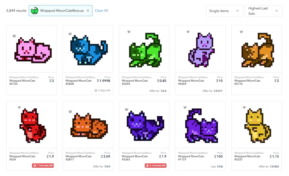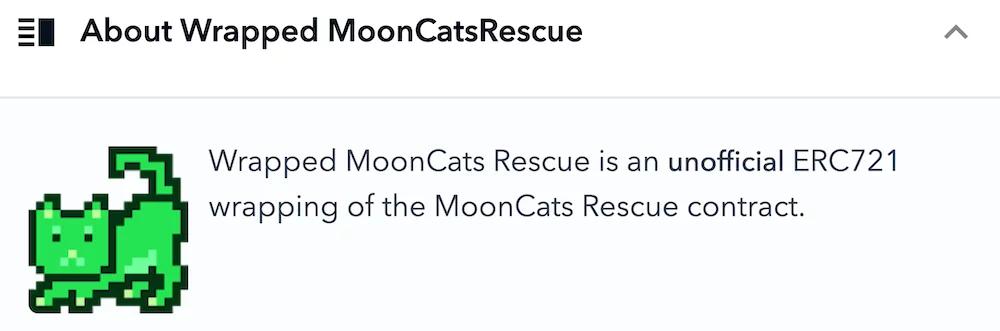 This next one is actually a reboot and revival of a much older project. By wrapping these ‘Moon Cats’, this once mostly dormant fork of CryptoPunks can now be traded on NFT marketplaces.