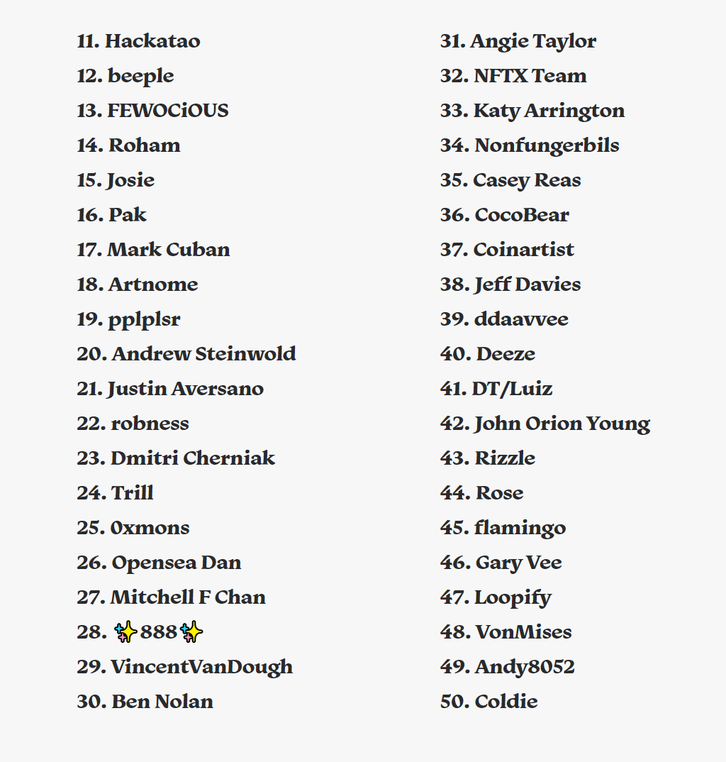 We approached some of the biggest personalities in the crypto NFT space and asked them to make their own lists. It is one of those things ‘’easier said than done’’, but we managed to collect more than enough data by being mildly annoying with DMs.