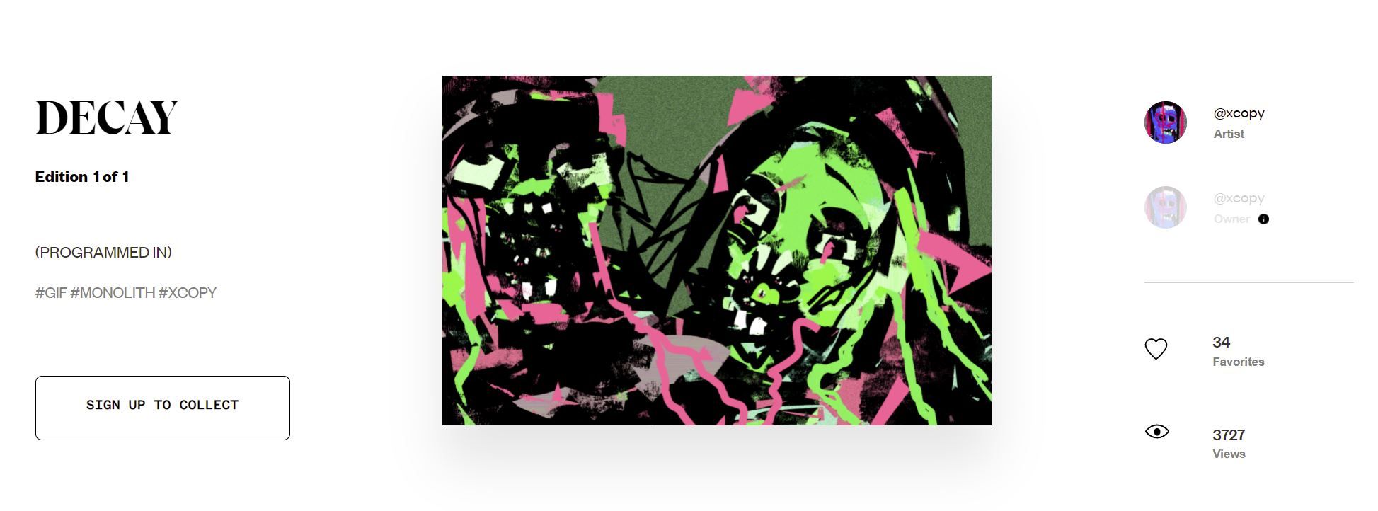 We recently covered XCOPY’s most significant sales. The artist has shown no signs of slowing down or losing value, having generated over 1,150ETH in his last three primary sales alone (setting aside the secondary sale of “A Coin for the Ferryman?” for 1330ETH). Although his art is now out of reach for the vast majority of collectors, the deep social commentary evident throughout XCOPY’s body of work has taken on an even greater gravitas with the new price floor for his 1/1s. The artist continues to shatter pricing expectations with each new release. Just five days ago, the artist listed “DECAY” on SuperRare.