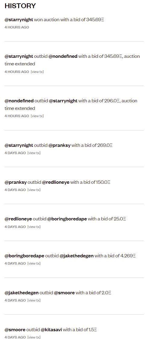 Within minutes, user @mullet placed an offer of 12.5ETH, which was accepted as an initial bid by the artist, triggering an auction. Following a number of lowball bids, a bid of 25ETH was placed by @redlioneye, followed by a bidding war between @pranksy, who came in at 150ETH and @starrynight, who came in at 269ETH. The auction didn’t live much longer, as @starrynight topped an intervening bid of 296ETH, winning the auction with 345.69ETH, for a total transaction value of ~$1.5 million USD at the time of publication.