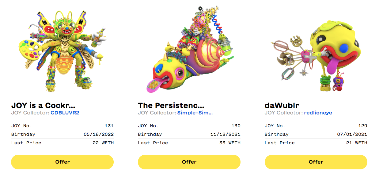 This part of the project is continually evolving. JOY seeks to put more power in the hands of collectors and owners and recently forked to a new contract. This gave collectors more capabilities and the bonuses have been coming thick and fast ever since. JOY owners now have keys to the JOY shop, allowing them to create their own JOYtoys. Collectors can even collaborate with JOY on new creations - earning 50% royalties as they do.