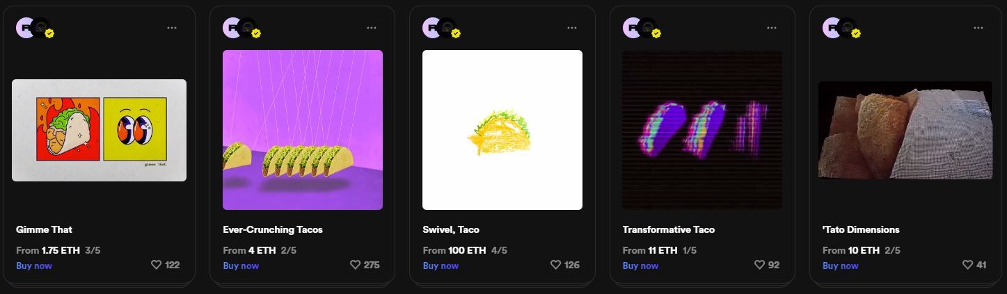March 8, 2021 – @Taco Bell announces the launch of NFT Taco Art, which it describes as “iconic and original artwork inspired by our tacos at the easily digestible price of our menu items. Now fans can own their favorite tacos and hold them in their hearts and digital wallets.” All profits were donated to the Taco Bell Foundation.