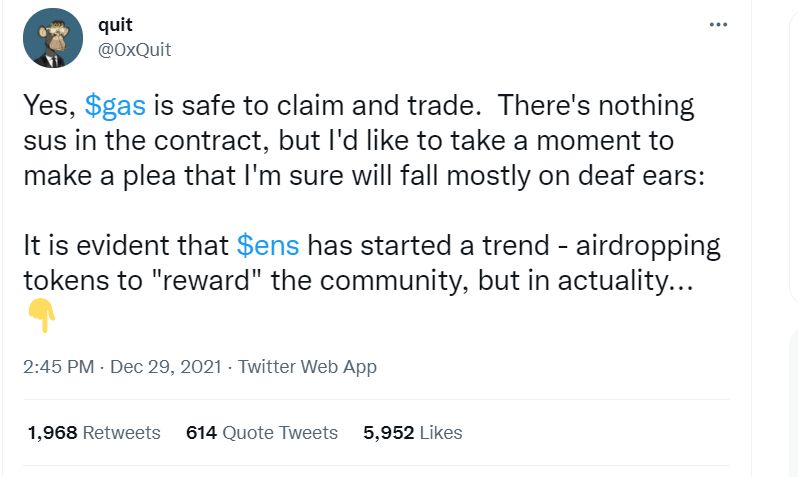 In comparison with the $ENS airdrop the team said something to the tune of "We didn't airdrop you free money, we airdropped you responsibility". This statement is extremely straightforward and sets the tone for engagement with the token right out the gate. I guess in some way it was $ENS that really started the trend when they airdropped the token to all users that previously owned an ENS address.