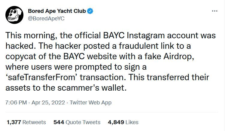 According to BAYCâs official Twitter account, the hacker posted a fraudulent link to a copycat BAYC website on Instagram, promoting a fake Airdrop. To receive this Airdrop, users were prompted to sign a âsafeTransferFromâ transaction, which connected their wallet to the site and transferred their assets to the hackerâs wallet.