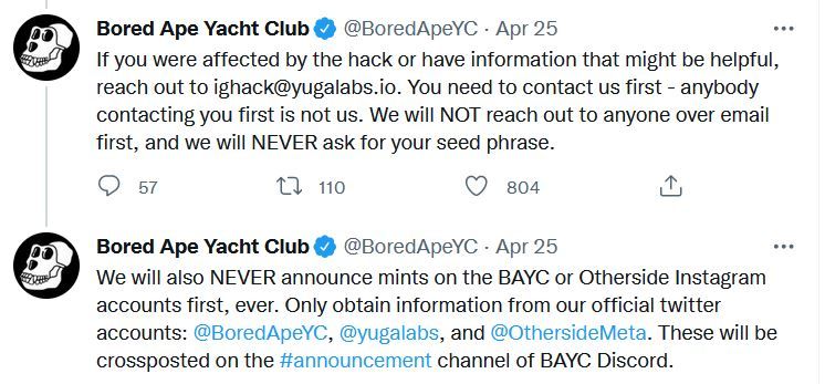 BAYC acted swiftly, alerting the community to the hack, removing the post and malicious links, and regaining control of the account before the day was done. BAYC also reminded followers that mints and air drops would only be announced on their official Twitter accounts and cross-posted on Discord.