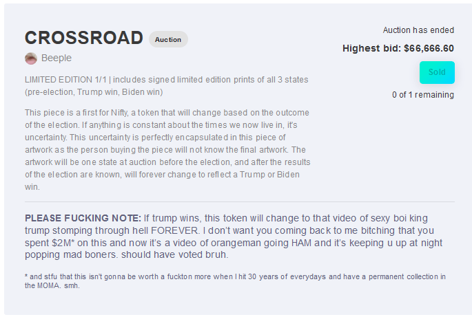 What is revolutionary behind CROSSROAD is that the final artwork will change depending on the outcome of the U.S. election. So the owner doesn't really know which version he will end up getting.