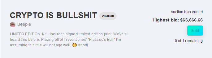 ... both being 1/1 editions in auction reached the price of 66.666 $ each. Very nice Halloween inspired amount and record breaking for NiftyGateway, the previous placeholder was Trevor Jones with 55.555$. Winner of the auction was Pablofr so he broke his own record because he is also the owner of âPicassoâs Bullâ. Our crystal ball is predicting that the next amount to break this record will be 77.777$ or maybe 69.420$
