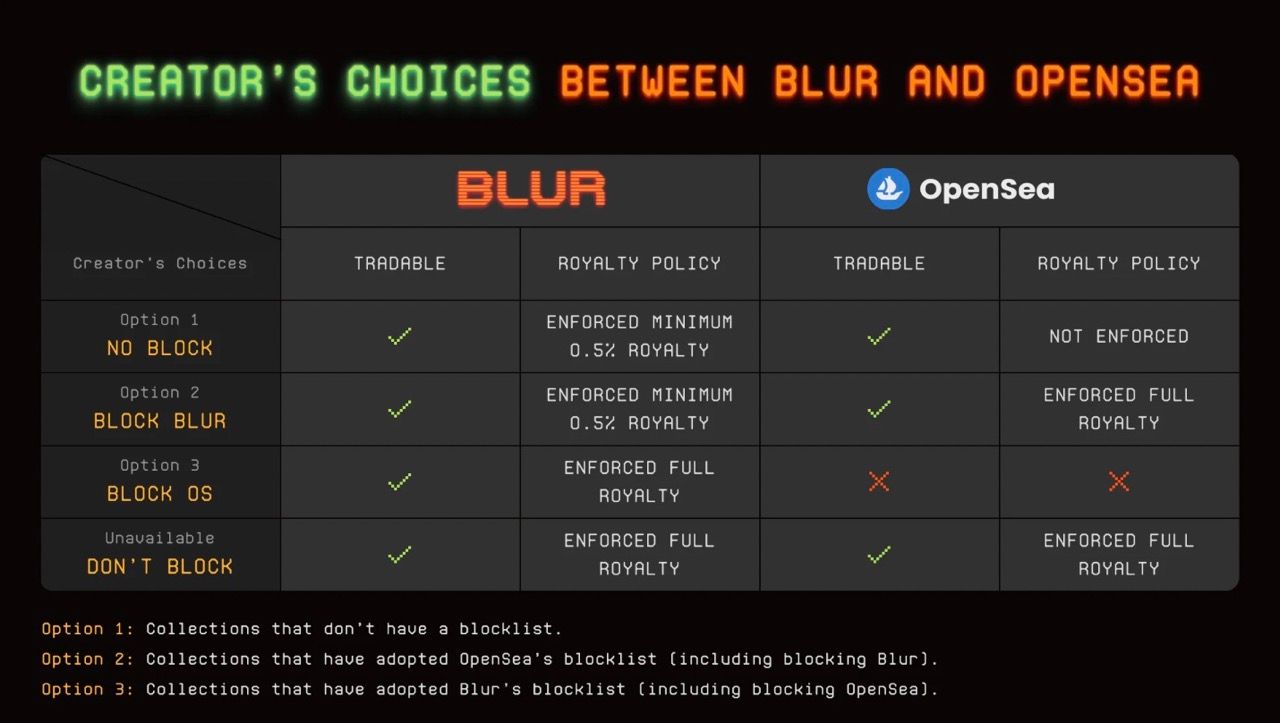 On top of rewarding degen traders with valuable airdrops, Blur has gone on the offensive in the royalty realm. Right now, there is a blacklist, or blocking, war between the two rival exchanges. Despite the decentralized free market ethos of web3, if an artist wants their rightful cut of trades, they have to choose a side! The choice: does a collection go with Blurâs or OpenSeaâs tools? As far as Blur is concerned, the best way for artists to get their full royalties, is to block OpenSea and whitelist Blur. The reason has to do with Blurâs ability to avoid OS's blacklist. Essentially, OpenSea tried to create a blacklist for their collections that would block trading on Blurâit failed. Thus, if an artist chooses to use OSâs royalty enforcement, traders will dodge fees by going to Blur. On the other hand, if a collection trades on Blur with their royalty enforcement, traders will be locked out of OS and forced to accept full royalties on Blur. Seems like checkmate for OS, right?Â