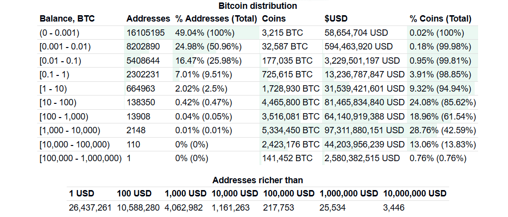 Data shows that at the current price levels, any person with a touch over 55 BTC has crossed the millionaire zone. Statistics show that there are 664,900 unique addresses with anywhere between 1-10BTC and 2.3 million unique addresses with 0.1 to 1 BTC each. Stats from bitinfocharts.com also indicates there are 25,810 unique addresses that own a million dollars worth of bitcoin. Beyond those million-dollar whales, 3,442 addresses contain $10 million in BTC today as well.
