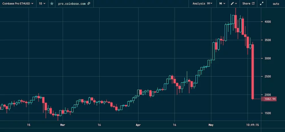 Ethereum experienced a massive drop over the course of hours, if that long. After reaching a peak of over $4,300 the second largest crypto by market cap fell over 50% in price in just over 1 week. After such an epic run up should we really be totally surprised?