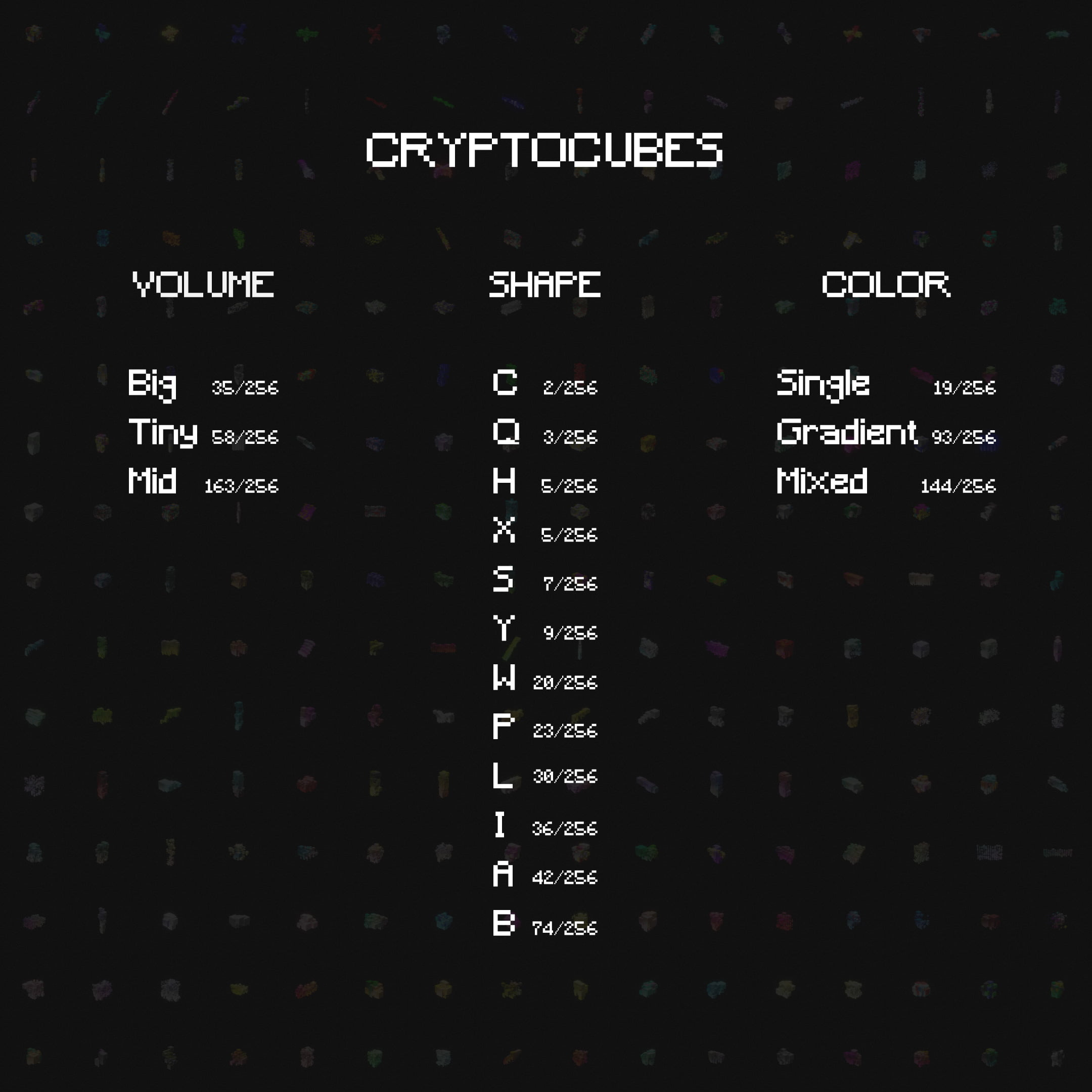 CryptoCubes are algorithmically generated volumetric abstractions limited to only 256. These NFT's are generated by a script written in Python and create a 3D NFT that is usable in metaverses. Each of these NFT's are uniquely mixed with different attributes. These attributes vary from volume, shape, and color.