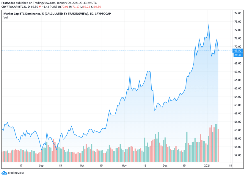 As ETH skyrockets, it’s expected for other altcoins to follow. It is projected that BTC Dominance will fall and will make room for altcoins.