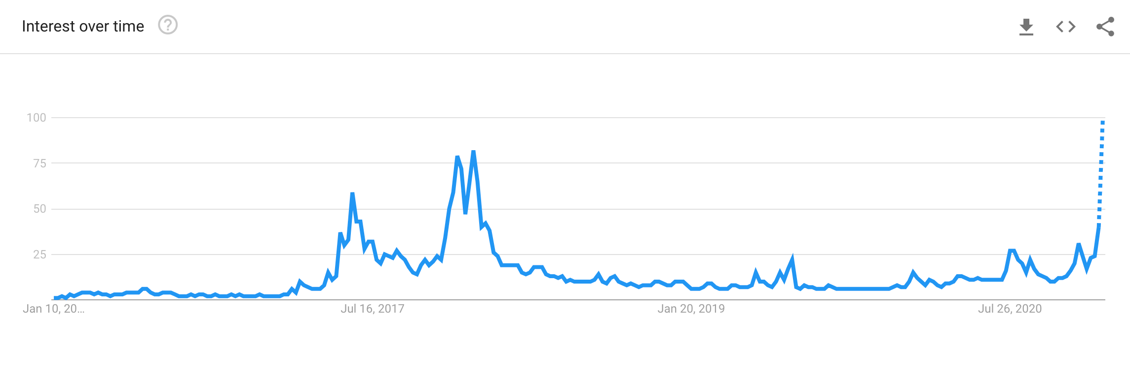 ETH’s last peak in searches was back in January of 2018, the month when ETH hit an ATH of $1,432.88.