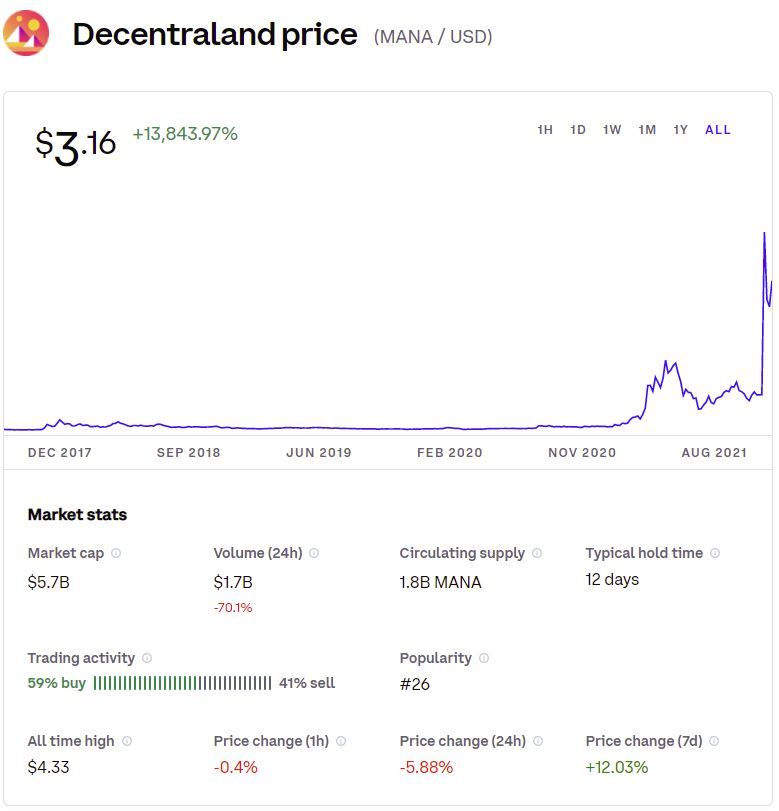 Facebook recently announced that it is changing its parent name to “Meta,” which signals a pivot in its corporate strategy. The company will begin focusing on the metaverse as a development of online social interactions. That project is still months or years out, but there are existing players in the space, including Decentraland and The Sandbox, which have been around for many years and have relatively recently integrated cryptocurrencies and NFTs to better monetize the experiences they offer. Both universes allow users to purchase plots of land that can be customized by individual owners in many ways. Both also offer tokens that are used as world currencies as well as games and opportunities for interacting with others through avatars. Decentraland, in particular, saw a huge spike in trading volume of parcels and assets following Facebook’s announcement, with a similar move in its token, Mana.