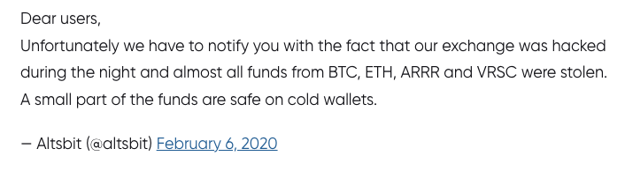 There aren't many thefts so devastating that they shut down whole exchanges. Altsbit had only been trading for a few months when it ceased operations with the following chilling message: “our exchange was hacked during the night and almost all funds from BTC, ETH, ARRR and VRSC were stolen.” Stranger still, the hacking group LulzSec (thought to be largely defunct since 2011) appeared to claim responsibility. LulzSec was behind lots of high profile hacks including the Playstation Network, the CIA and Bethesda - usually for mayhem rather than profit. Nonetheless, if the group is still out there and targeting crypto, it shouldn’t be underestimated.