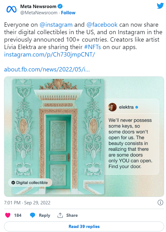 NFT showcasing is the latest of many web3 features Meta has been rolling out over the past few months. The company first started Instagram’s NFT integration for select creators and collectors in May; in June the integration came to Facebook. Cross-posting started in August.