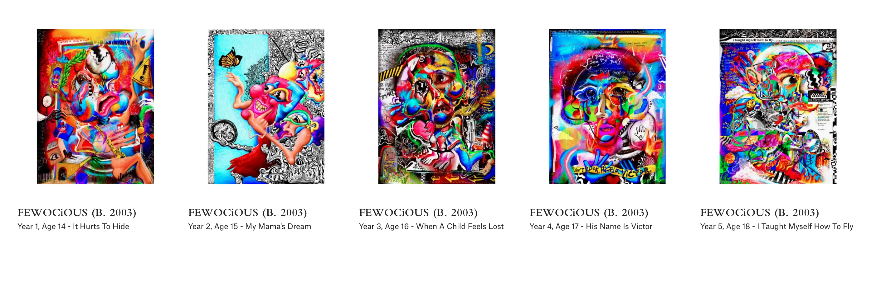 “Hello, i’m Victor (FEWOCiOUS) and This Is My Life is a coming of age story through art. Through five new digital pieces and physical paintings, as well as an archive of his earliest never-before-seen drawings from each year, FEWOCiOUS’ new defining series will capture each formative year of his growth from age 14 to 18 as a young transgender artist in the digital era.”
