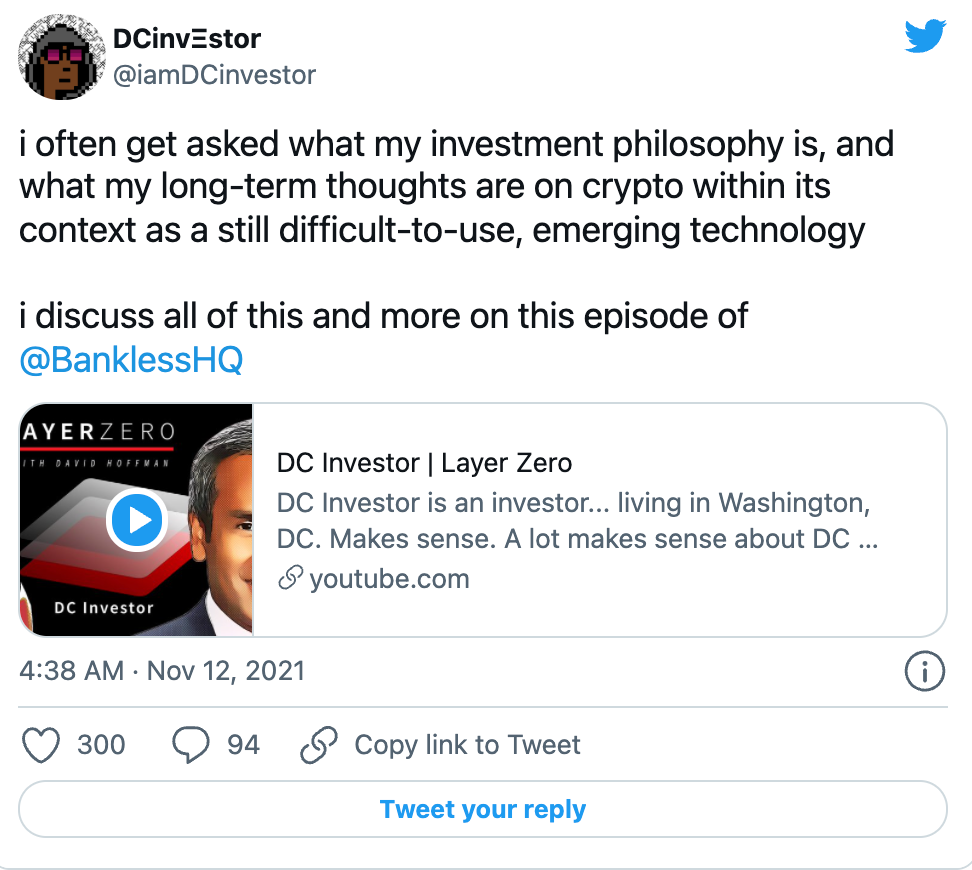 A Web2 employee turned crypto enthusiast, with a strategy of flipping DeFi gains into NFTs that may have long-term value. He is a real collector in the literal sense as he rarely sells, if ever. His views and philosophy have so far aligned with the Ethereum core community and vision.Â