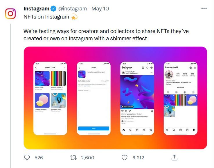 This goes beyond simple image-sharing. According to its announcement, Instagram will be able to connect to a digital wallet, allow users to choose which NFT images to share, and automatically tag both creator and collector. Wallet connectivity is currently possible for Ethereum and Polygon, with Flow and Solana compatibility coming soon.
