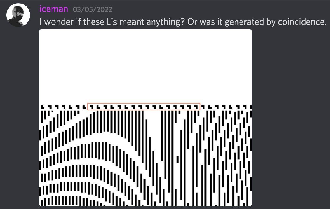 March 5th, the night of the reveal, the keen eyes of iceman did not fail him as he stumbled upon a seemingly random pattern intertwined within the mathematical rhythmic beauty known in most Autoglyph-type work. A series of L’s, both right side up and upside down, bordered the top of the image. Badr discovered his message and concurred that the L’s seemed more than just ornamental. He wrote a script to parse the image and turn the L’s into 1’s and 0’s, just like any good nerd would do. He stumbled upon something when it came to exactly 256 bits - divisible by 8 - which pushed him to try interpreting as ASCII.