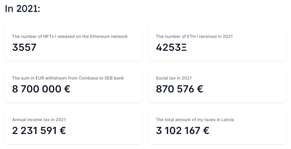 Shvembldr is a generative artist who started working with NFTs in 2021. The numbers around him are staggering. 3557 NFTs released. 4253 ETH earned. âŹ8,700,000 withdrawn to his bank account. âŹ870,576 paid in social tax in 2021. Annual income tax of âŹ2,231,591 and a total tax burden of âŹ3,102,167. These figures are taken from his website.