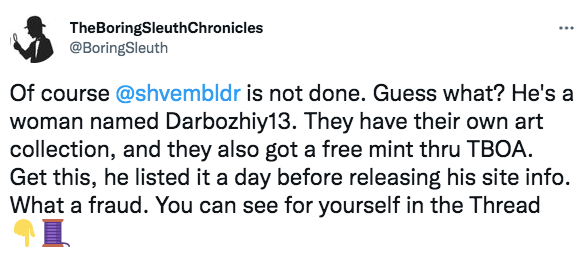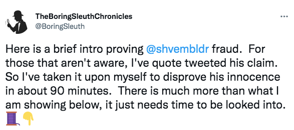Unsurprisingly, Shvembldr struck back at what he terms a âpseudo investigationâ and suggests that @BoringSleuth has tried to pressure his friends into making false statements: