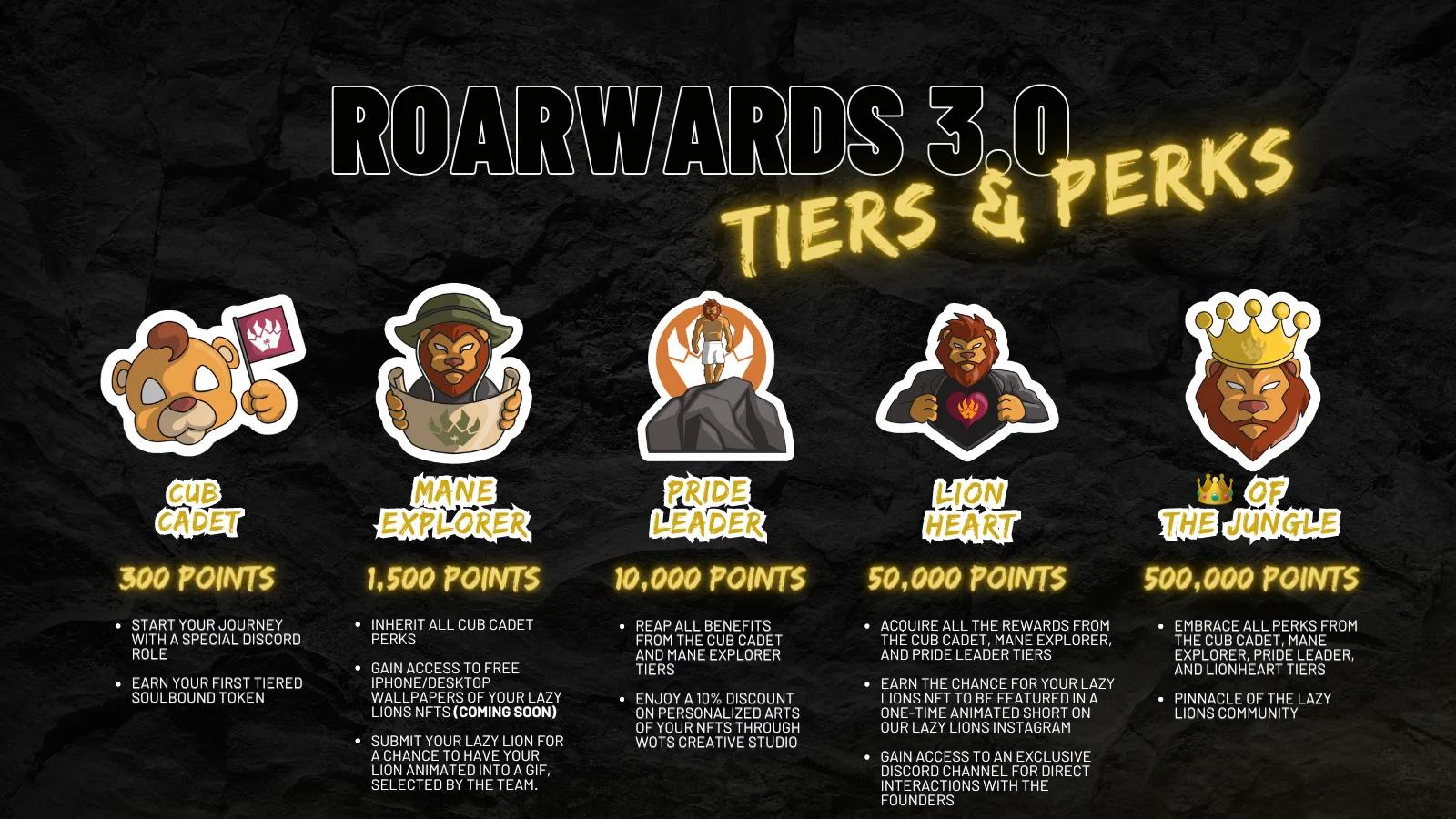 As users accumulate ROAR Points through various activities and engagements within the Lazy Lions ecosystem, they progress through different tiers, unlocking unique Soulbound Tokens at each level. These tokens act as both a symbol of accomplishment and a practical tool within the community.